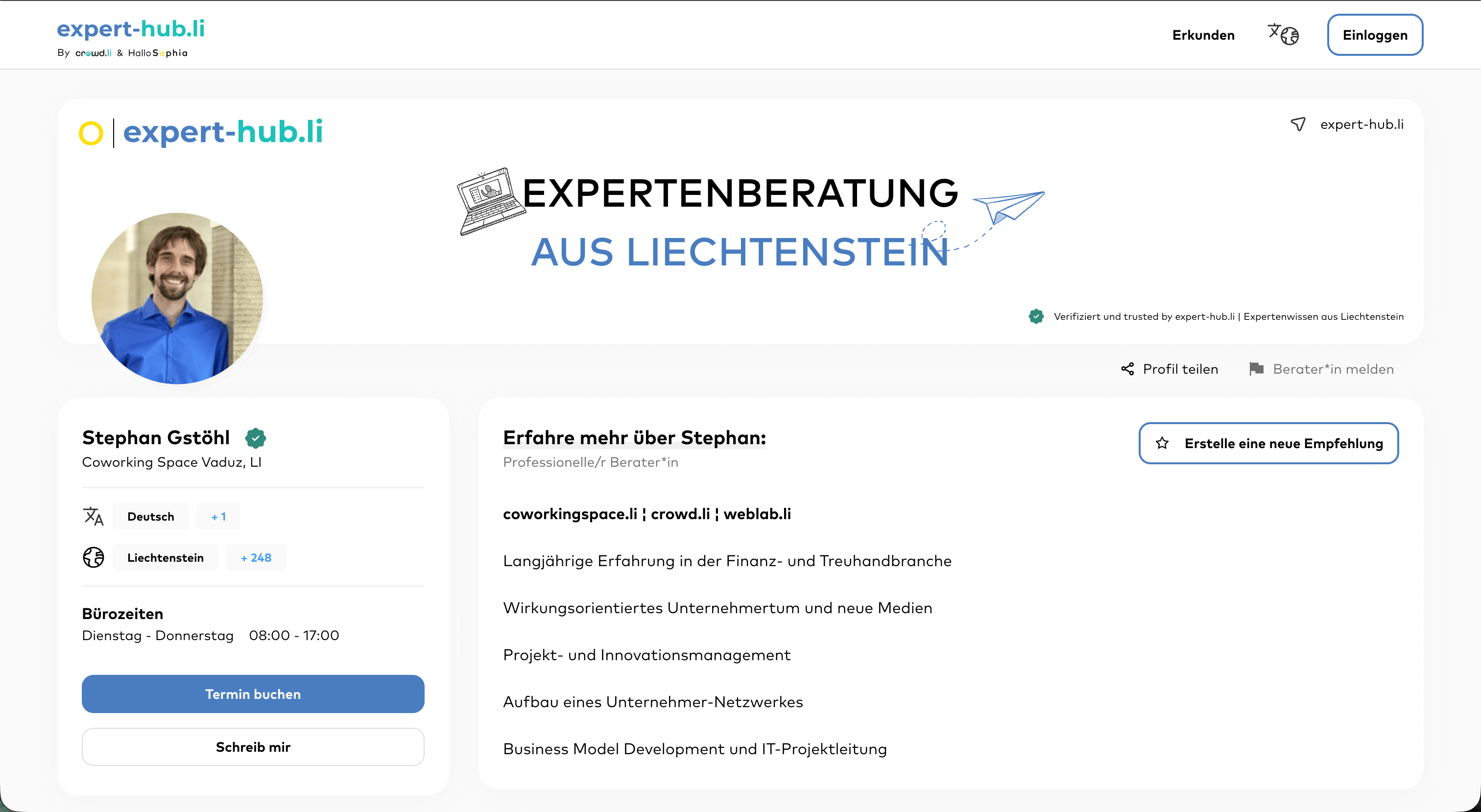 expert-hub.li is the expert platform for Liechtenstein, initiated and founded by crowd.li and GB Marketing & Solutions GmbH, and operated and further developed by the Austrian startup HalloSophia by finothek GmbH. You can find more information about expert-hub.li on crowd.li.
